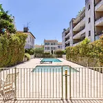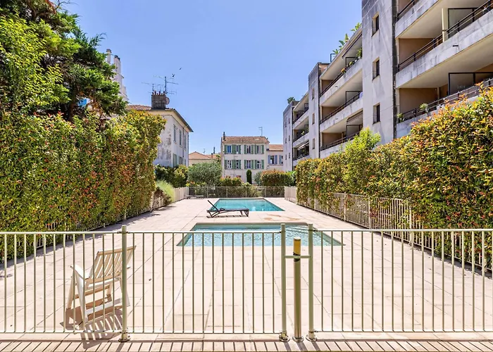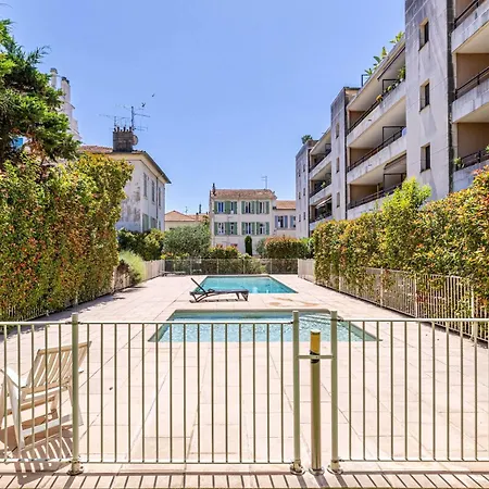 Charming Apartment With Balcony-Pool - Cannes, Cannes şehrinde, Notre Dame d'Esperance Church'den 16 dakikalık yürüme mesafesinde bulunan denize nazır bir dairedir. Konaklama tesisindeki 1 yatak odası, 1 banyo odası ve donanımlı bir mutfak misafirlerin hizmetine sunulur.